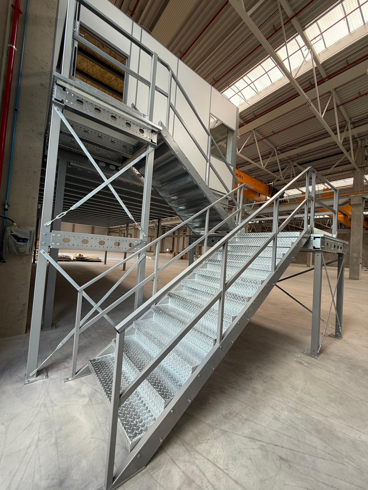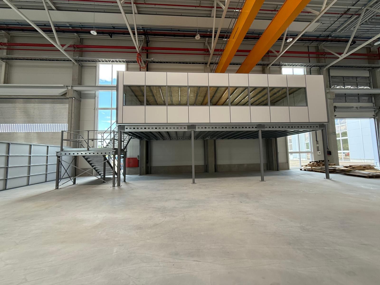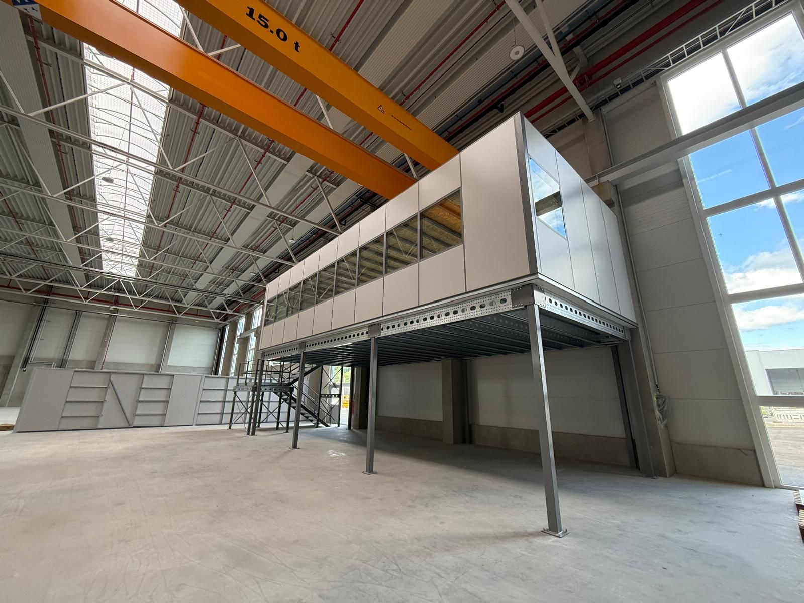 Das erste von insgesamt drei Hallenbüros auf Stahlbühnen ist baulich fertiggestellt – mit großzügigem, noch offenem Innenraum.