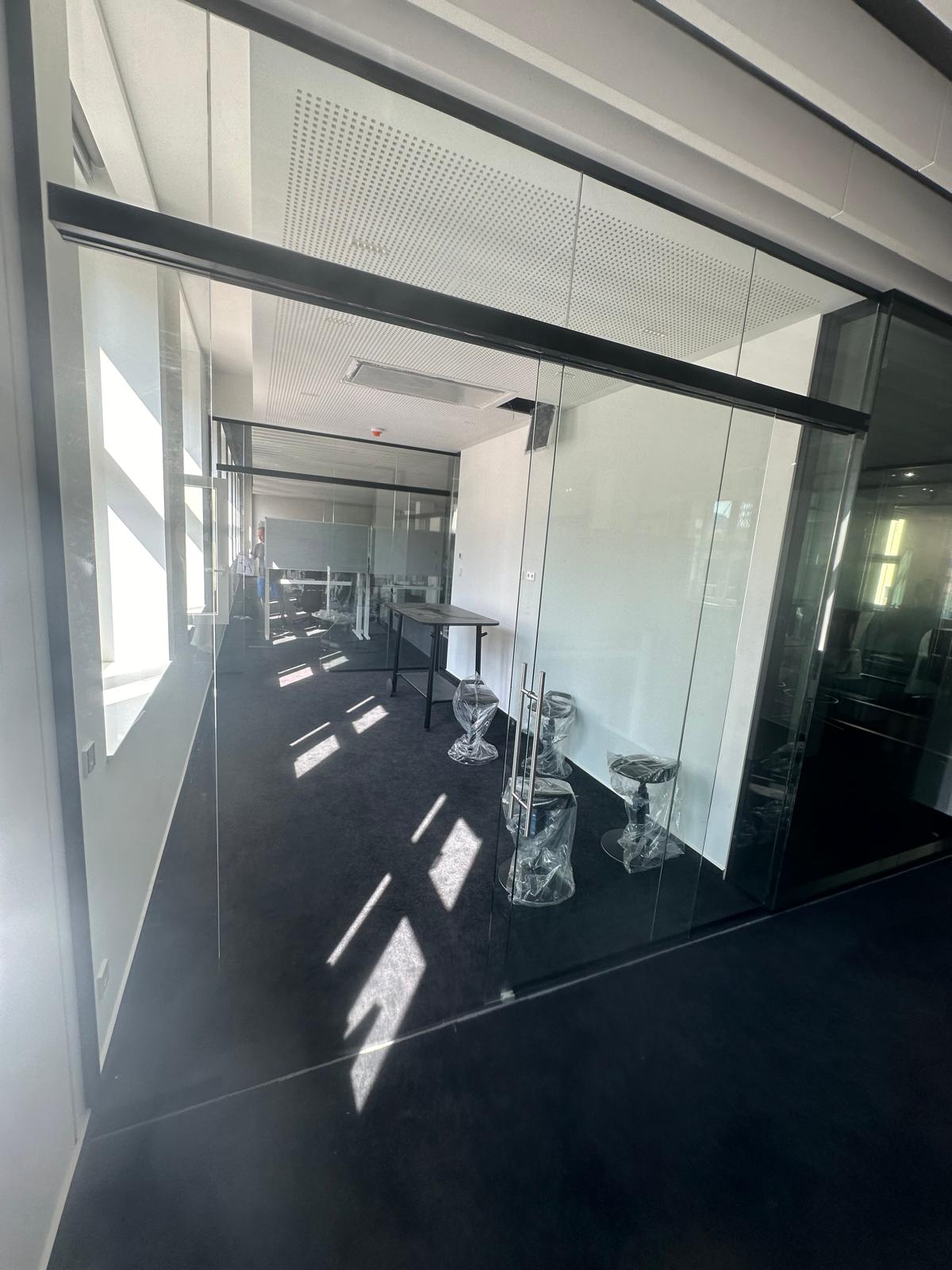 Mit einer Systemhöhe von 2200mm und einer durchdachten Führungsschiene, die durch Bohrungen im Glas direkt auf das Glas geklemmt wird, garantiert sie ein minimalistisches und modernes Erscheinungsbild – und das völlig zargenlos.
