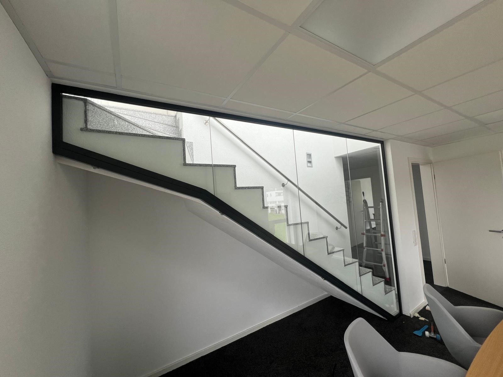 Heute zeigen wir Ihnen stolz unser neuestes Projekt: die Trennwand vor dem Treppenauge haben wir mithilfe einer Sonderkonstruktion mit dem System Horizon umgesetzt.