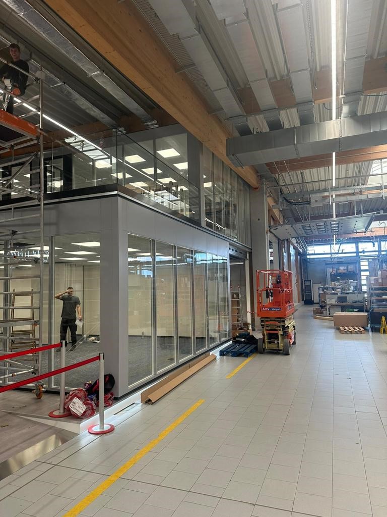 Umgesetzt wurde eine zweiteilige Stahlbühne mit Portalaussteifung, die mit dem innovativen Trennwandsystem String2 ausgestattet ist. Das Design umfasst Vollverglasungen und Stahlpaneele, wobei das Innere in der eleganten Farbe RAL9010 weiß gestaltet ist, während die Außenseite mit RAL9006 weißaluminium einen modernen Akzent setzt.