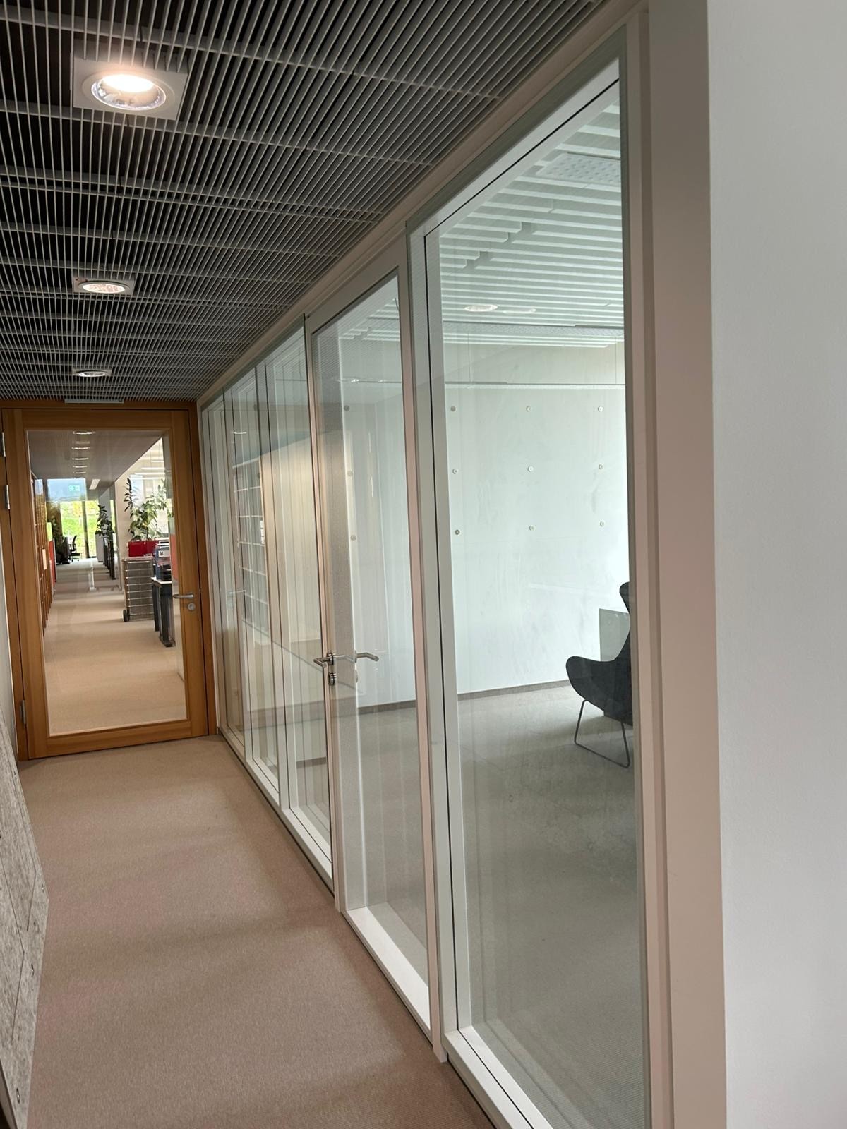 Mit einem Schalldämmwert von 46 dB (Wand) und 41 dB (Türe) entsteht eine perfekte Balance aus Transparenz und Diskretion – ideal für effizientes Arbeiten und vertrauliche Gespräche.